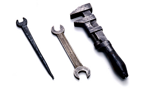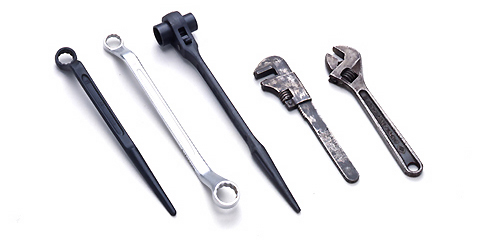 左起单口扳手,双口扳手,拉切特扳手,马达扳手,蒙基伦奇