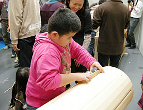 现在,为了完成木材的表面,使用了台刨。用完的刨子后的木材真的会变得光滑。参加者们对其光滑的手感非常吃惊。